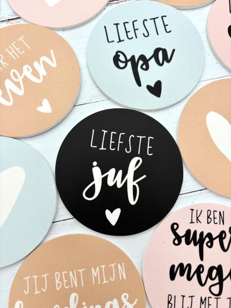 Onderzetter voor de liefste juf. Deze leuke onderzetter kun je geven als cadeautje en is te gebruiken als onderzetter om kringen op de tafel te voorkomen.